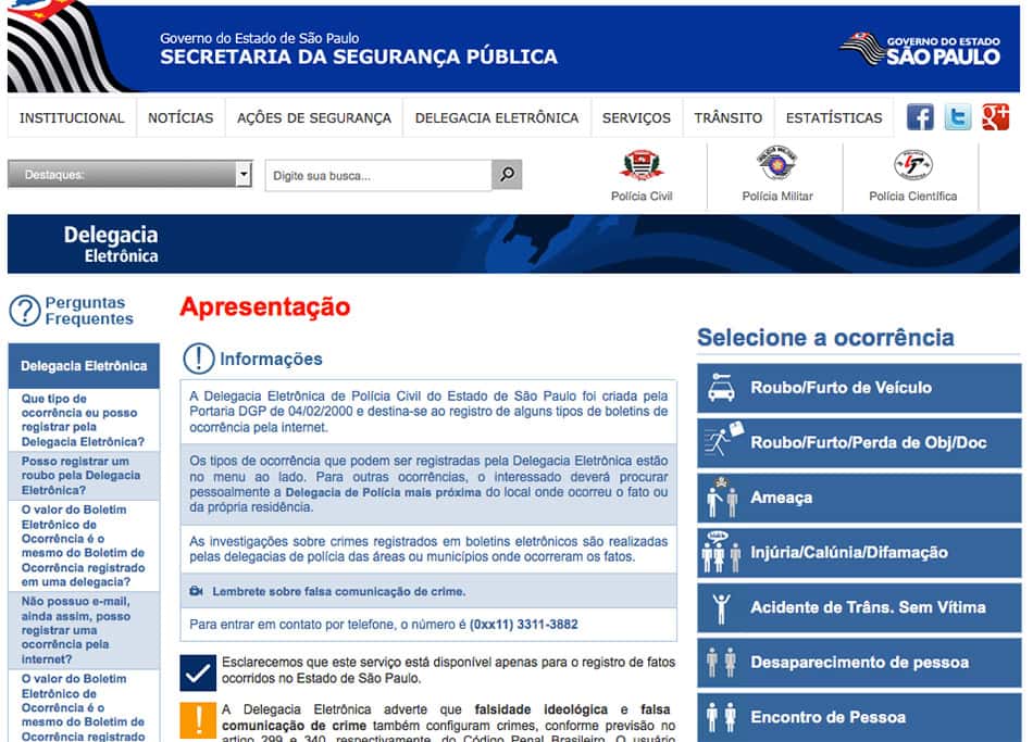 Entre os Estados que possuem delegacias virtuais para o registro de Boletins de Ocorrência estão São Paulo, Rio Grande do Sul e Santa Catarina. Nestas páginas, as pessoas podem denunciar ocorrências para alguns tipos de crimes, como furto de veículos e celulares, além de registrar o desaparecimento de pessoas, ameaças, roubos sem vítimas de lesão corporal e morte, injúria, difamação, calúnia, acidentes de trânsito, entre outras ocorrências.